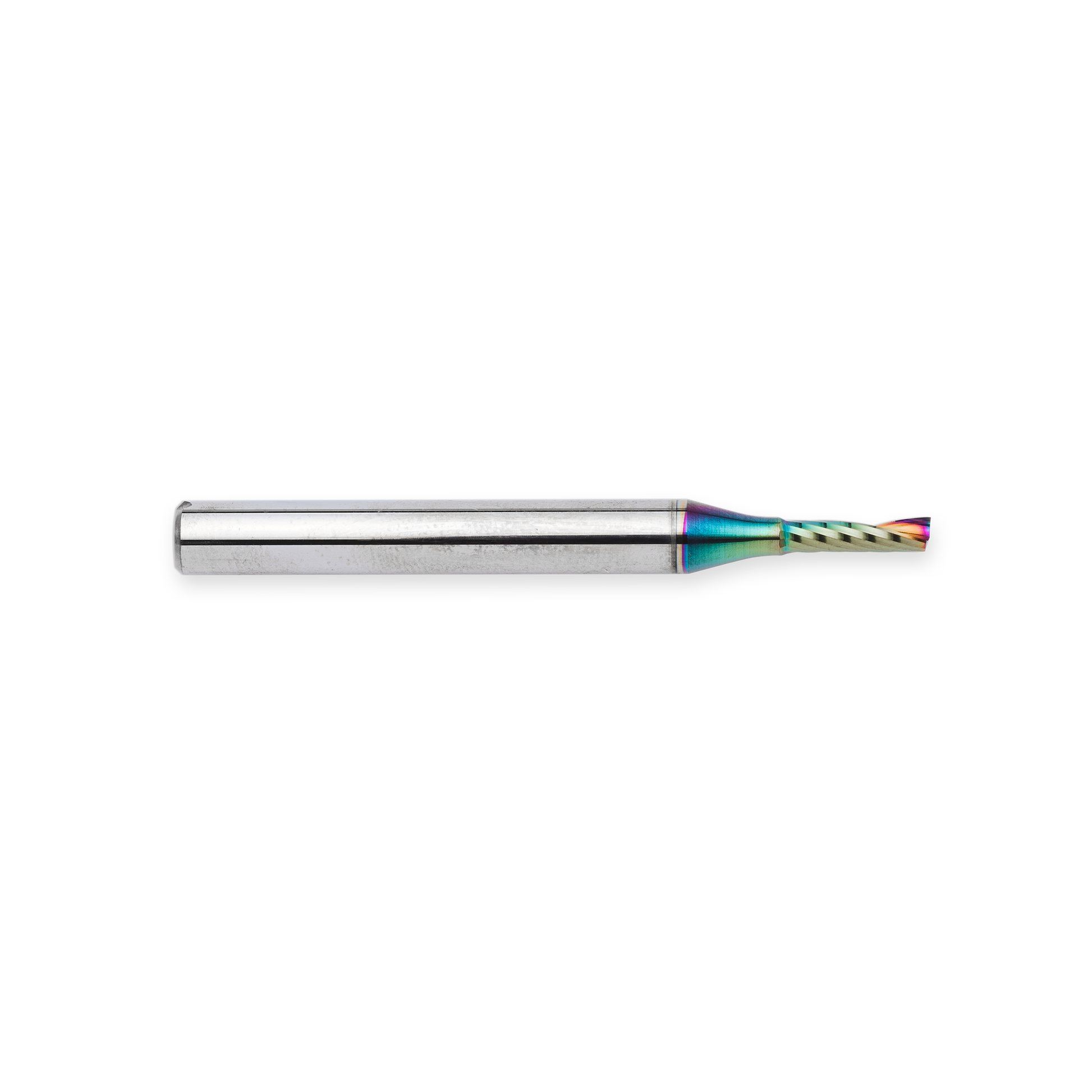 Single flute, up-cut, DLC coated, tungsten carbide router bit for Zund machines suitable for milling various materials.