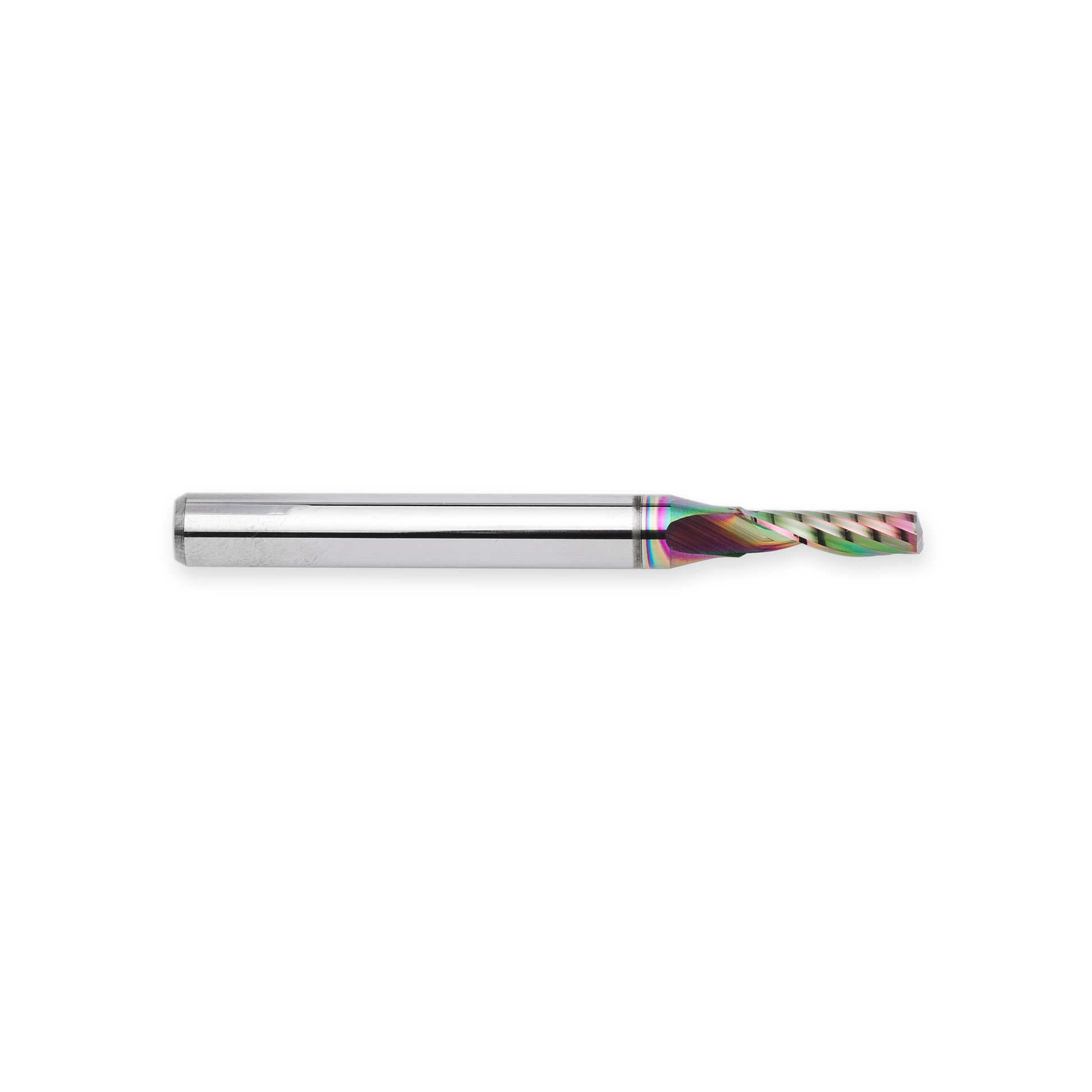 Single flute, up-cut, DLC coated, tungsten carbide router bit for Zund machines suitable for milling various materials.